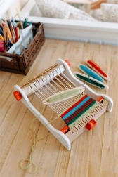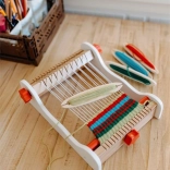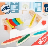 Die kompakte Tischkonstruktion mit übersichtlicher Kettführung und einfachem Durchziehen des Schusses erleichtert Kindern das Verstehen der Webgrundlagen vom ersten Versuch an.