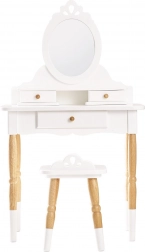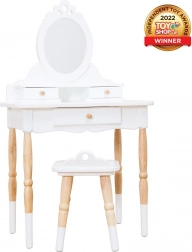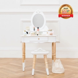 Wunderschöner Frisiertisch im Retro-Stil, der sicher die Träume so mancher Kinder erfüllt. Er kommt im Kinderzimmer oder Spielzimmer besonders gut zur Geltung, ist sehr elegant und zieht beim Spielen wirklich die Aufmerksamkeit der Kinder auf sich. Viktorianischer ovaler Spiegel aus erstklassigem, unzerbrechlichem Acryl, zweitstöckiger Tisch, 3 Schubladen – perfekt, um Schätze und Kleinigkeiten zu verbergen. Hergestellt von einem Team talentierter Spielzeugmacher aus nachhaltigem Gummibaumholz, ein wunderschönes Stück mit viel Liebe zum Detail. Tisch und Stuhl haben interessant geformte Beine. Die Kombination aus Weiß und naturbelassenem Holz sorgt für einen zeitlosen Look. Das schöne Möbelstück kann von Generation zu Generation weitergegeben werden. Hauptmerkmale: Frisiertisch mit Stuhl, für Kinder von 3 bis 6 Jahren, maximale Belastbarkeit 50 kg, ethisch aus nachhaltigem Holz gefertigt, mit ungiftigen Farben auf Wasserbasis bemalt. Spielzeug-Auszeichnung: Independent Toy Gold Award Winner 2022. Honeybake Kollektion: Die Spielzeuge in dieser Kollektion eignen sich hervorragend zum Entdecken, helfen Kindern, ihre Fantasie, sozialen und verbalen Fähigkeiten sowie kognitive Funktionen zu entwickeln. Traditionelles Design mit modernen Details, das Kindern garantiert Spaß macht. Honeybake ist die am höchsten ausgezeichnete Kollektion von Le Toy Van – prämiert für Design, Qualität, Sicherheit sowie Bildungs- und Spielwert.