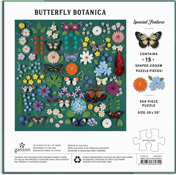 Das Butterfly Botanica Puzzle bereitet allen Natur- und Entspannungsliebhaberinnen und -liebhabern Freude. Die detailreiche botanische Illustration mit leuchtenden Schmetterlingen und Blumen kommt im fertigen Format 50,8 × 50,8 cm besonders zur Geltung. Dank 15 einzigartig geformter Teile ist das Puzzeln noch unterhaltsamer und visuell beeindruckender.