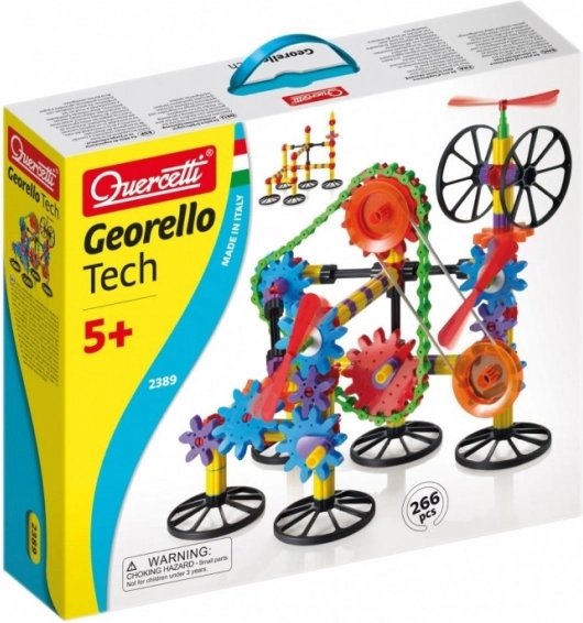 Der Georello Tech Baukasten überträgt Rotationsbewegung zwischen entfernten Zahnrädern und demonstriert anschaulich grundlegende mechanische Funktionen, wie sie in realen Maschinen zu finden sind. Dank Kette und elastischem Riemen verbinden Kinder Zahnräder über größere Distanzen und schaffen noch komplexere Konstruktionen.