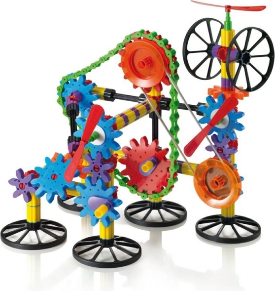 Bunte Komponenten, Stäbe, Räder und Zahnräder ermöglichen einfache wie komplexe Modelle. Der Fantasie sind keine Grenzen gesetzt.