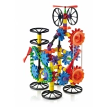 Verbinden Sie Zahnräder, Kette und elastischen Riemen und beobachten Sie, wie die Drehbewegung auch über größere Distanzen übertragen wird. Ein großartiger Einstieg in die Welt der Technik.