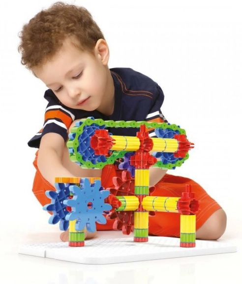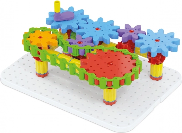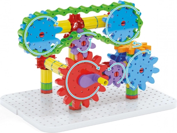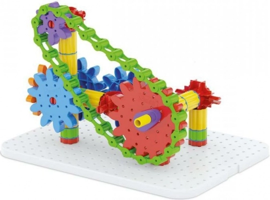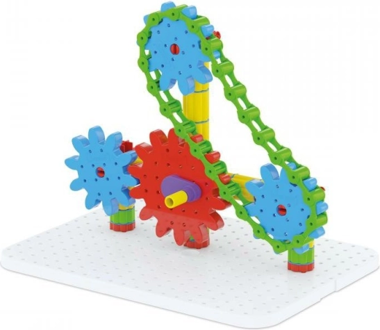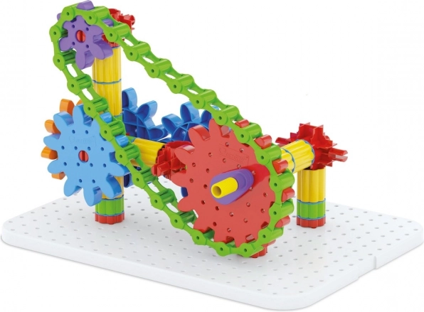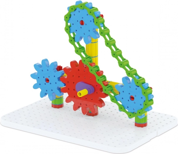 Der Baukasten ist aus haltbarem Kunststoff hergestellt und für Kinder ab 5 Jahren geeignet. Er enthält Komponenten wie eine weiße Grundplatte, Zahnräder verschiedener Größen, eine Kette und vieles mehr, was es Kindern ermöglicht, die Welt der mechanischen Bewegungen zu entdecken.