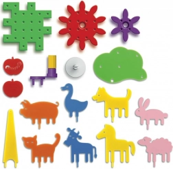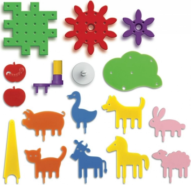 Quercetti Georello Farma ist das ideale Spielzeug für jedes Kind, das gerne baut und kreiert. Dieses Getriebebausetzen enthält Lochplatten, Achsen, Zahnräder und Tierfiguren, die einfach zu einer beeindruckenden Bauernhofszene zusammengefügt werden können. Mit einer Kurbel kann der Mechanismus in Bewegung gesetzt werden, und man sieht, wie alles sich wie ein Karussell dreht.