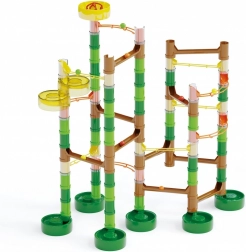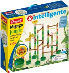 Die Murmelbahn Migoga Jungle bietet Kindern ab 4 Jahren spielerisches Lernen. Bunte Murmeln starten gleichzeitig und rollen anschließend über verschiedene Wege voller Brücken, Spiralen und Rutschen, inspiriert von Formen des Dschungels. Kinder können nach Anleitung bauen oder völlig eigene Konstruktionen kreieren.