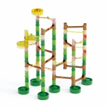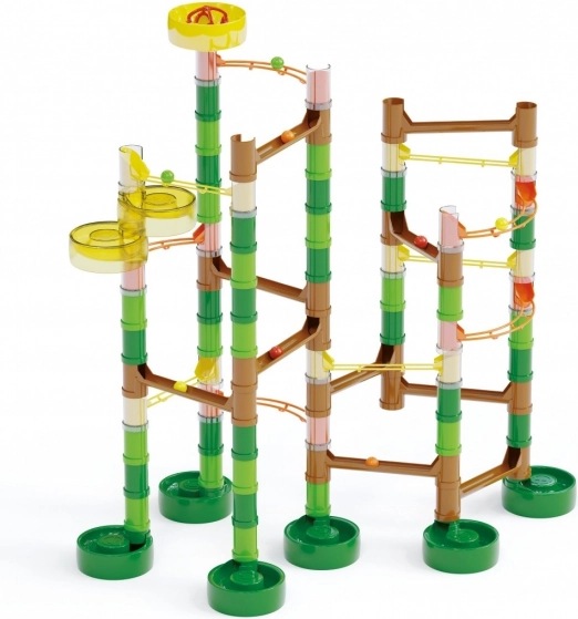 Verschiedene Rutschen, Brücken, Säulen und Spiralen ermöglichen den Aufbau nach Anleitung oder das Gestalten völlig eigener, origineller Strecken.