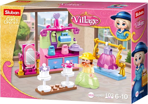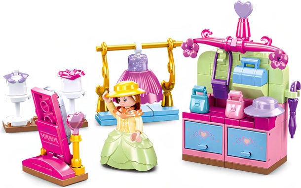 Das Sluban-Bauset „Bekleidungsgeschäft im historischen Stil“ sorgt dank seiner Einfachheit und der Möglichkeit, eigene Spielszenarien zu kreieren, für großen Spielspaß. Das Set enthält 103 Teile und eine Figur, mit denen sich verschiedene Modeszenen im Laden nachstellen lassen.