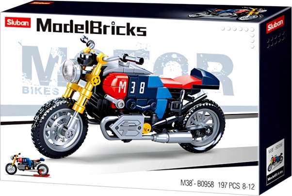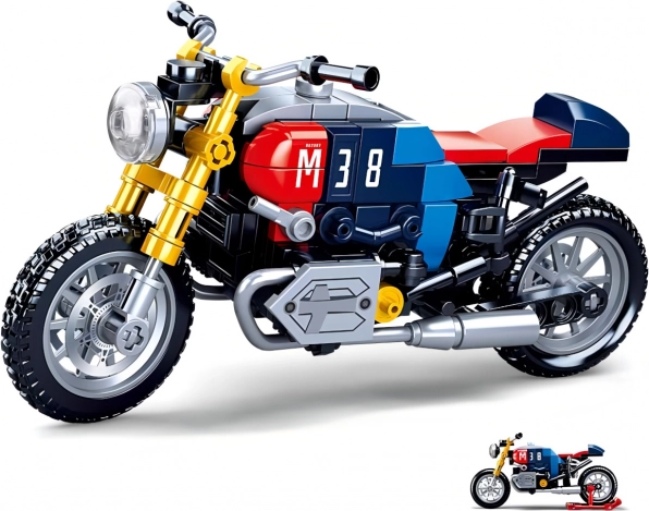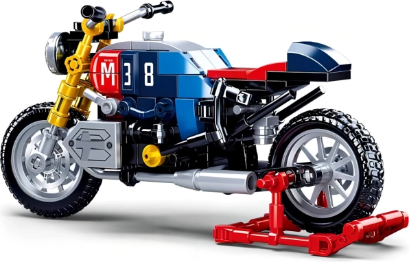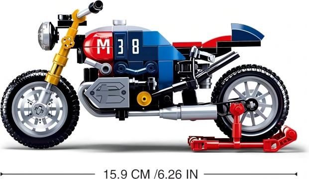 Dieses detailreiche Motorradmodell im ikonischen Café-Racer-Stil bietet eine attraktive Kombination aus Blau, Rot und Gelb mit der markanten Nummer 38. Realistische Elemente wie funktionsfähige Räder und Auspuffe machen es zu einem ansprechenden Motorrad-Bausatz zum Spielen und Ausstellen.