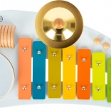 Xylophon, Becken, Rassel und eine abnehmbare Trommel bilden ein kompaktes Set, das Kinder motiviert, verschiedene Klänge und Rhythmen zu entdecken.