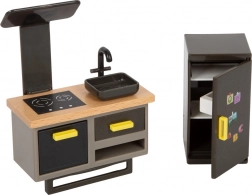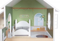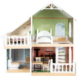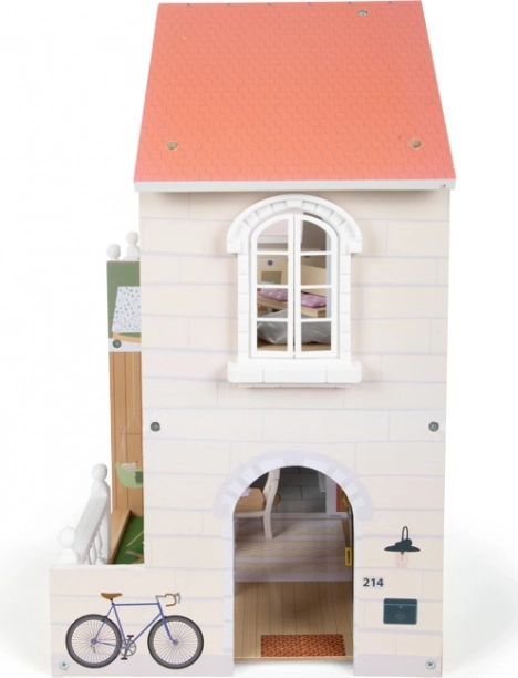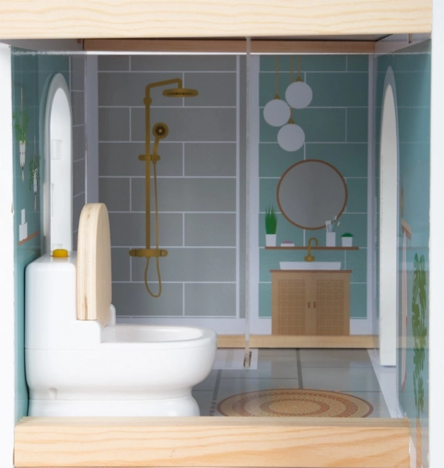Dieses moderne Puppenhaus bietet ein offenes Wohnkonzept mit Küche und Essbereich, Schlafzimmer, Bad und einer großen Terrasse mit Sitzgelegenheit. Durch die offene Front ist das Spiel von vorn zugänglich und mehrere Kinder können bequem gleichzeitig spielen. Die helle Fassade und gedeckten Farben fügen sich harmonisch in jedes Interieur ein.