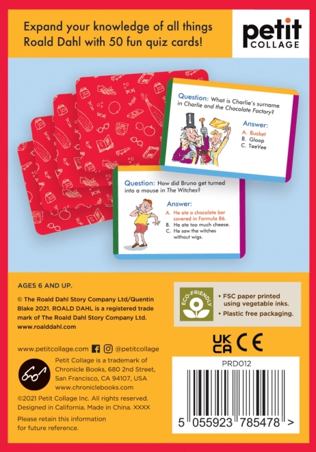Werden Sie zum Meister der Geschichten von Roald Dahl mit Quizkarten, die Ihr Gedächtnis und Wissen herausfordern. Enthalten sind 50 Fragekarten, die Ihnen und Ihrer Familie zu Hause oder unterwegs großartige Unterhaltung bieten. Dank der Illustrationen von Sir Quentin Blake sind die Karten zudem ein echter Blickfang. Hergestellt aus 100 % FSC-zertifiziertem Papier und mit pflanzlichen Farben bedruckt, erfüllen sie strenge Umweltstandards.