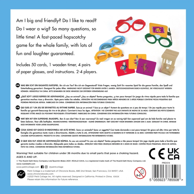 "Was ist das? Ein Spiel mit Motiven von Roald Dahl" von Petit Collage zieht Sie in die magische Welt der literarischen Figuren mit lustigen Brillen und illustrierten Karten. In diesem unterhaltsamen Spiel können Spieler ihre Kenntnisse zu beliebten Figuren durch Fragen und Antworten testen. Das Spiel ist für 2–4 Spieler geeignet und ideal für Familienzeiten.<