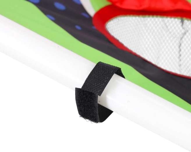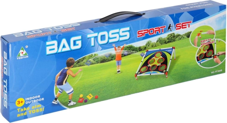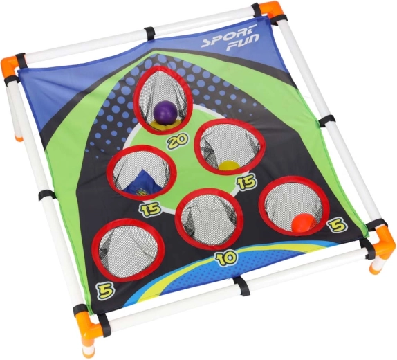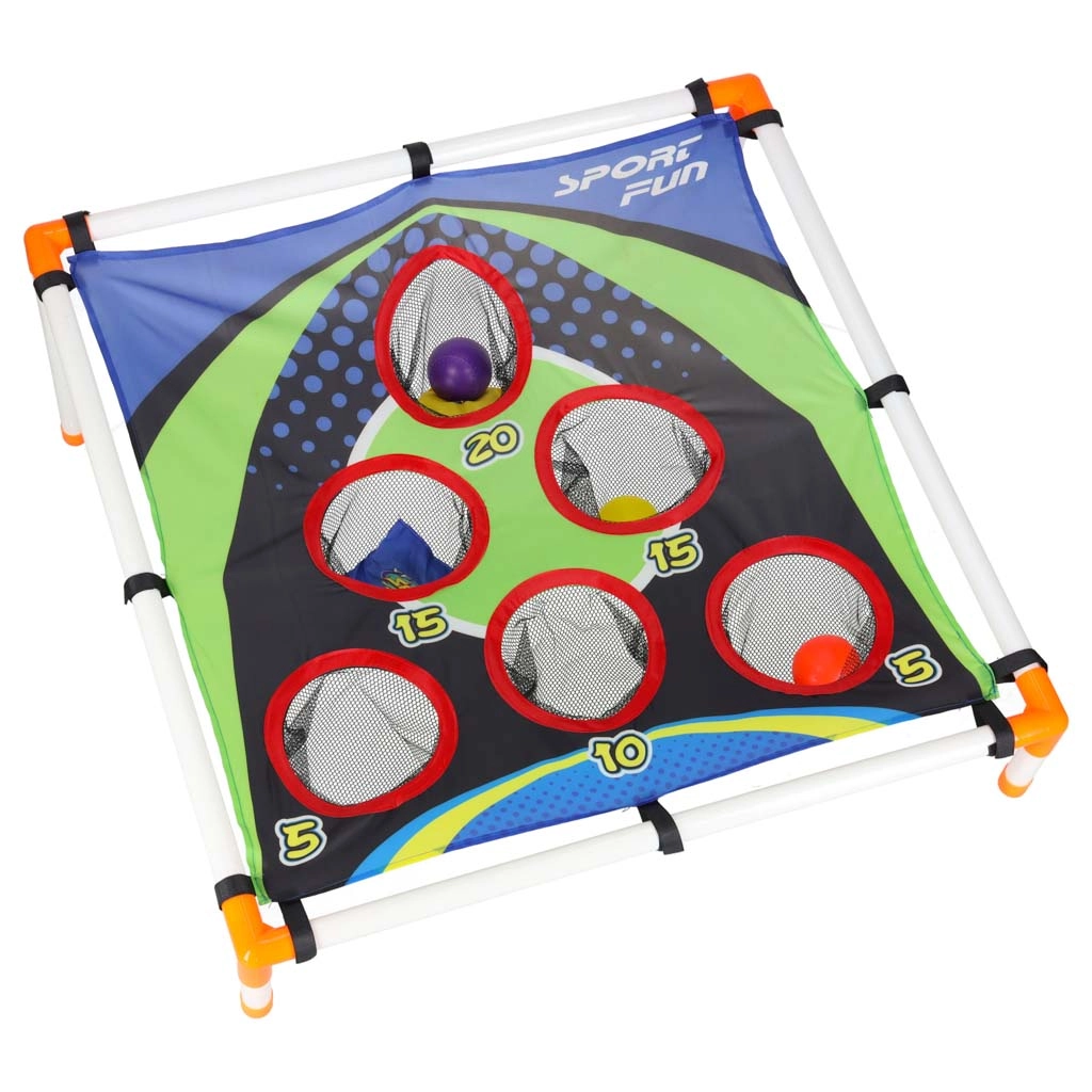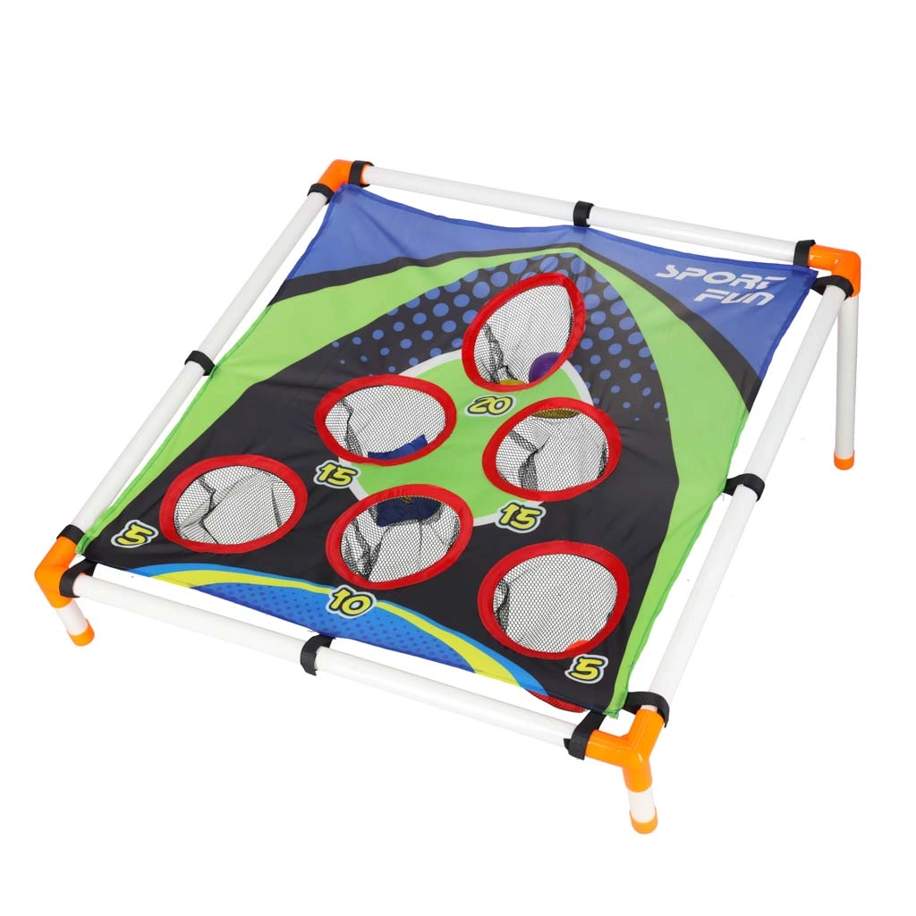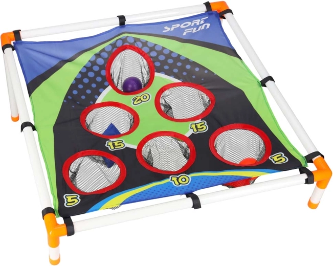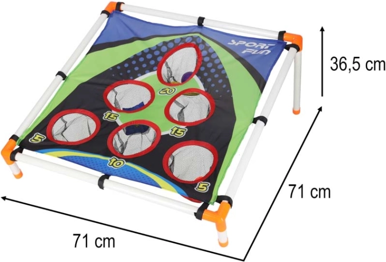 Die leichte Konstruktion aus Kunststoffrohren mit geneigtem Ständer sorgt für Stabilität, die robuste Textilfläche mit fünf bis sechs gewerteten Öffnungen fängt Säckchen und Bälle in Netzen auf. Die Montage ist intuitiv, und das gesamte Spielfeld lässt sich mühelos überallhin mitnehmen.