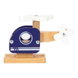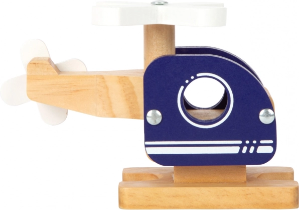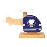 Der Holz-Hubschrauber hat eine natürliche Holzoptik mit blauen und weißen Details, die ihm einen spielerischen Look verleihen und ihn sicher für Kinder machen.