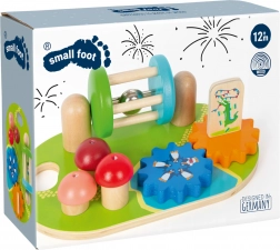 Die Holzplatte bietet verschiedene bewegliche Elemente wie Zahnräder und Schwämme zur Förderung der Feinmotorik.