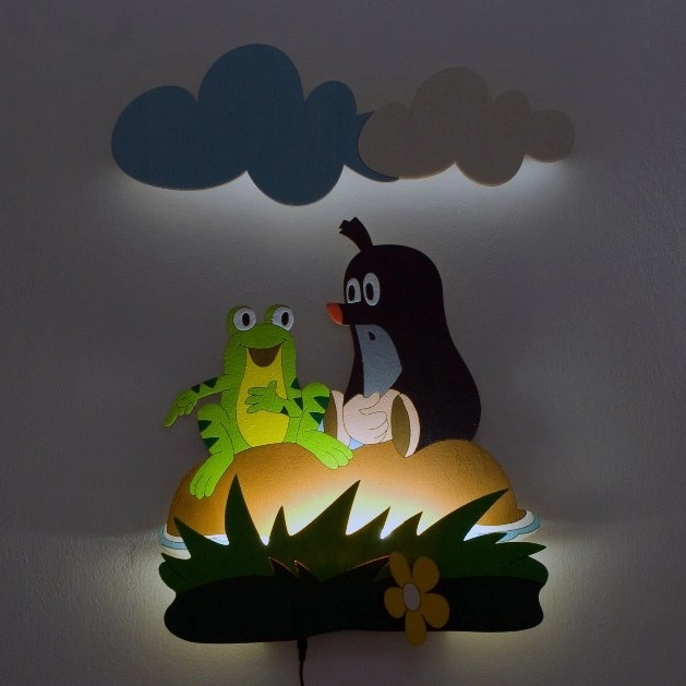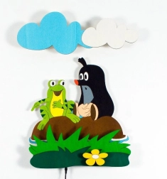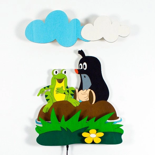 Niedliche Kinder-LED-Lampe mit dem Motiv vom kleinen Maulwurf und dem Frosch bietet angenehme Stimmungsbeleuchtung, Fernbedienung mit einer Reichweite von bis zu 15 m und stufenloses Dimmen sowie Voreinstellungen von 25/50/100 %. Dank des sparsameren Leistungsaufnahme von 1 W leuchtet sie nahezu ohne Kosten und merkt sich nach dem Einschalten die zuletzt eingestellte Helligkeit. Die handbemalte Ausführung aus Holz macht jedes Stück zu einer originellen Dekoration für das Kinderzimmer.