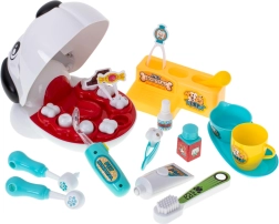 Das Set enthält eine Zahnbürste, einen Spiegel, ein Zubehörbrett und weitere Werkzeuge für realistisches Spielen.