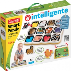 Der Quercetti Magnetische Einleger Bauernhof ist ein großartiges Spielzeug für kleine Kinder. Auf der einen Seite der Tafel können die Kinder Magnete in die vorbereiteten Öffnungen setzen, was ihnen hilft, die Erkennung von Formen und Farben zu entwickeln. Die Bildteile werden durch die Magnete leicht befestigt und können zur weiteren Verwendung praktisch aufbewahrt werden.