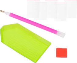 Das Set enthält alles, was Sie zur Erstellung eines strahlenden Kunstwerks benötigen: Bild, farbige Steinchen, Applikator, Trockenleim und Schale.