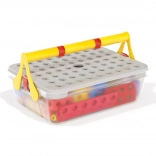 Alle Teile lassen sich in der stabilen Box mit Tragegriff verstauen. Das perforierte Deckel dient als Baufläche – ideal für zuhause und unterwegs.