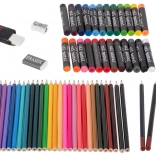 Buntstifte, Ölkreiden, Bleistifte, Radierer und Anspitzer für präzises Zeichnen, Schattierungen und ausdrucksstarke Farbflächen.