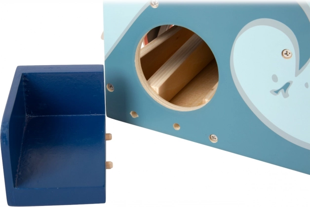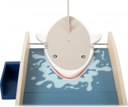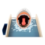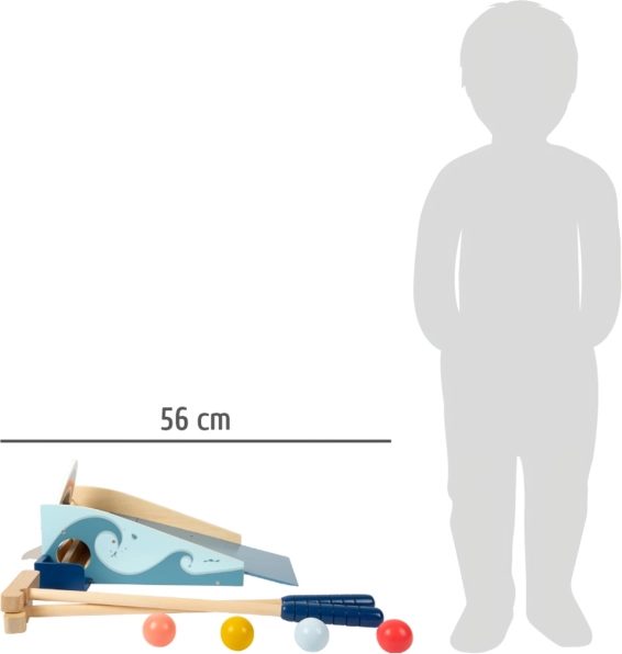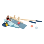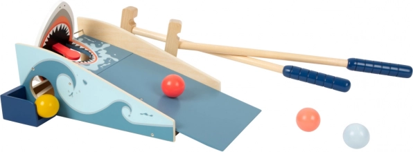 Verwandeln Sie jedes Zimmer oder den Garten in einen Mini-Golfplatz! Der Minigolf-Hai aus Holz bietet Kindern actionreichen Spaß und Training für Grobmotorik, Augen-Hand-Koordination und Geduld. Den Ball die blaue Rampe wie eine Welle hinunterrollen lassen und das geöffnete Maul treffen – der Hai schließt es beim Treffer und ihr feiert das Score.