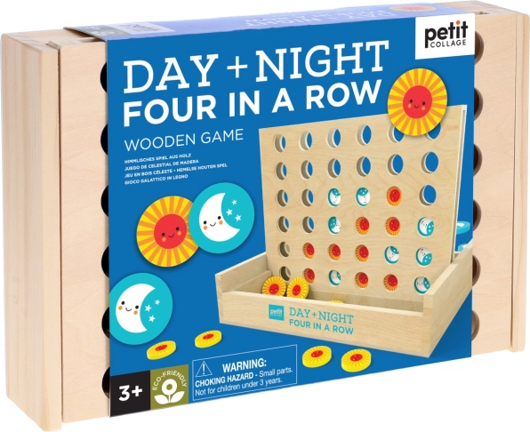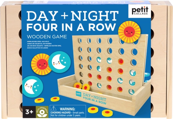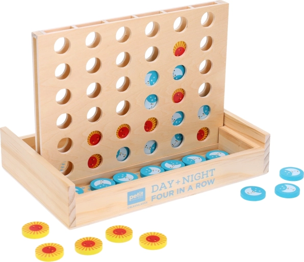 Das Holzspiel Vier in einer Reihe Tag und Nacht erfordert von den Spielern nicht nur schnelles Denken, sondern auch strategische Planungskompetenz. Ziel ist es, vier Spielsteine in einer Reihe auf dem Gitter zu platzieren. Die Spielsteine haben ein attraktives Sonnen- und Monddesign, das kleine und große Spieler begeistert.