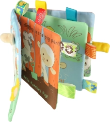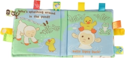 Das Buch besteht aus vier Stoffblättern, die eine kurze Geschichte auf Englisch enthalten. Dies hilft, Kinder schon früh mit einer Fremdsprache vertraut zu machen.