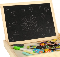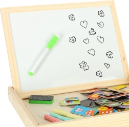 Die beidseitige 2-in-1-Lerntafel aus naturbelassenem Holz bietet eine weiße magnetische Seite zum Legen magnetischer Puzzles und zum Schreiben mit Marker sowie eine schwarze Kreideseite für klassisches Zeichnen. Enthalten sind ca. 100 Magnete mit Stadtmotiv, bunte Kreiden, ein abwischbarer Marker mit Filz und ein Schwämmchen – ideal zur Förderung der Kreativität und der Feinmotorik.