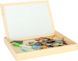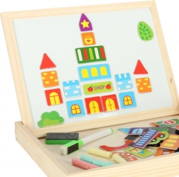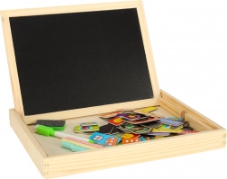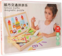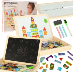 Die Tafel hat zwei Arbeitsflächen: eine weiße, magnetische zum Legen von Bildern aus Magnetteilen und zum Schreiben mit Trockenmarker, und eine schwarze Kreideseite zum Zeichnen mit Kreide. Das Thema „Stadt“ regt Rollenspiele an und unterstützt das Lernen von Farben, Formen sowie Grundlagen der Raumplanung.