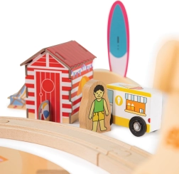 Diese Küsten-Eisenbahn bietet viel einfallsreichen Spielspaß und Lernen in einem. Kinder fahren auf der Strecke, passieren die große Sandburg, kommen an bunten Strandhäuschen vorbei und lernen dabei dank praktischer magnetischer Klapptafeln das Mülltrennen. Alles in hochwertiger Ausführung aus verantwortungsvoll gewonnenen Materialien mit unbedenklichen Farben und Lacken.