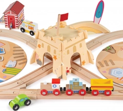 Das Highlight des Sets ist eine große Sandburg, durch die der Zug fährt. Sie verleiht der Bahn Höhe, Geschichte und neue Spielszenarien – Kinder trainieren so Aufmerksamkeit und Koordination.