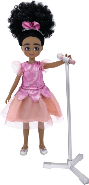 Die Puppe ist mit einem weißen Pelz, einem rosa Rock und einem Mikrofon auf einem Ständer ausgestattet, die ihr sternförmiges Outfit perfekt ergänzen.