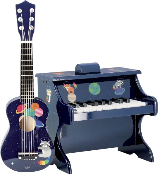 Wir präsentieren Ihnen die Weltraumgitarre, das ideale Instrument für kleine Musiker und Liebhaber von Weltraumabenteuern. Diese Kinder-Gitarre ist aus Holz gefertigt, was Qualität und Haltbarkeit garantiert. Ihr Design ist mit bunten Planetenmotiven und der Illustration eines Astronomen-Waschbären bereichert, was sie zu einem echten Traumspielzeug macht.