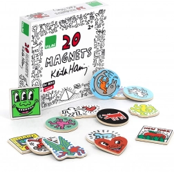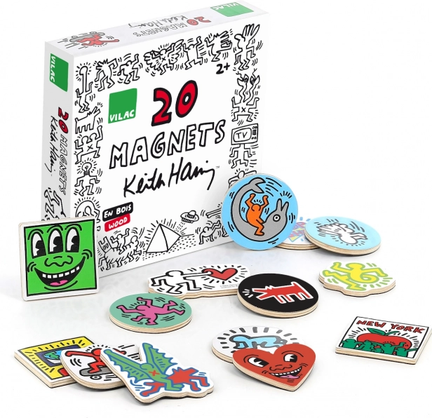 Bringen Sie die verspielte Energie der Pop-Art in Ihr Zuhause! Das Set mit 20 Holzmagneten von VILAC mit Motiven von KEITH HARING überzeugt durch unverwechselbares Design, leuchtende Farben und Freude am Gestalten. Dank der stabilen Holzausführung und des glänzenden Drucks sind die Magnete ideal für den täglichen Gebrauch am Kühlschrank, auf Magnettafeln oder Regalen.