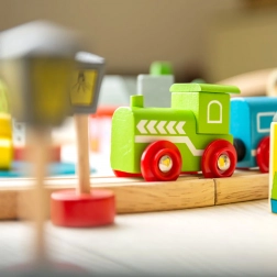 Das Set ist aus robustem Holz mit Metallteilen und Magneten gefertigt, die das Kuppeln der Waggons erleichtern. Die Teile sind mit den meisten Holz-Eisenbahnen auf dem Markt kompatibel, sodass Sie Ihre Bahn weiter ausbauen können. Die sichere Konstruktion und kräftigen Farben unterstützen die sensorische Entwicklung und die Feinmotorik.