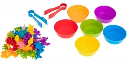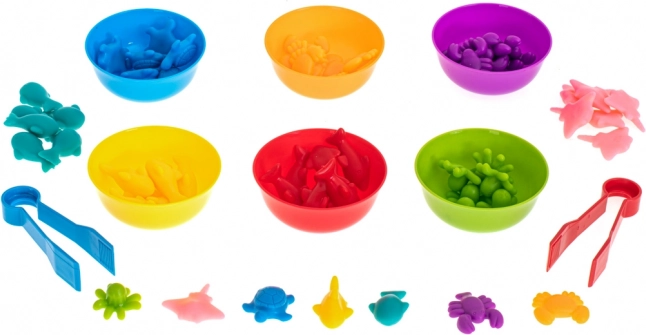 Dieses Lernset mit Meerestieren macht die ersten Schritte in die Mathematik zum Vergnügen. Kinder können die Figuren nach Farben in die Schalen sortieren, zählen, Mengen vergleichen und einfache Aufgaben erstellen. Die Pinzetten trainieren zudem den Pinzettengriff und die Hand‑Auge‑Koordination.