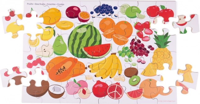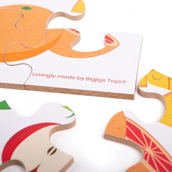 Das Puzzle enthält bunte Illustrationen, die Kindern helfen, verschiedene Obstsorten wie Wassermelone, Orange oder Bananen visuell zu erkennen.