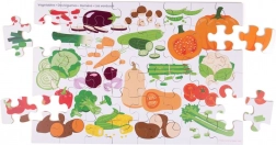 Das Puzzle umfasst verschiedene Gemüsesorten wie Kürbisse, Paprika und Karotten und lehrt Kinder über Ernährung und einen gesunden Lebensstil.