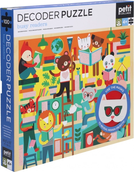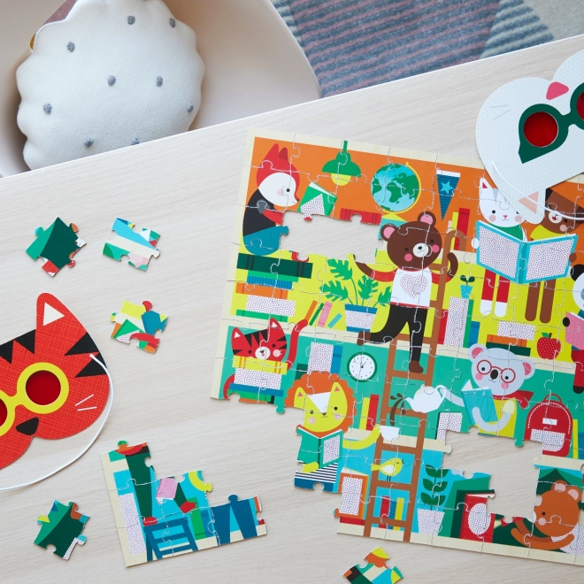 Entdeckt mit zwei mitgelieferten 3D-Brillen versteckte Objekte in der lebhaften Bibliotheksszene mit diesem unterhaltsamen Puzzle von Petit Collage.