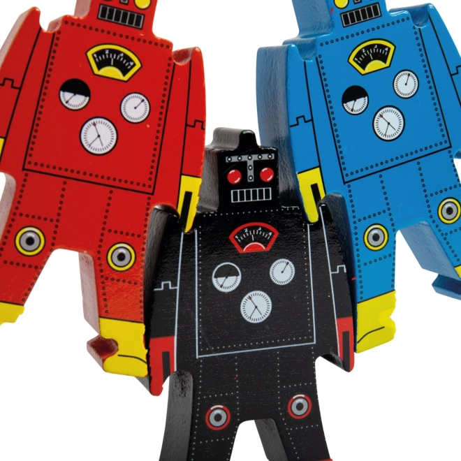 • 9 Holzroboter in leuchtenden Farben – variables Stapeln und Balance-Herausforderungen