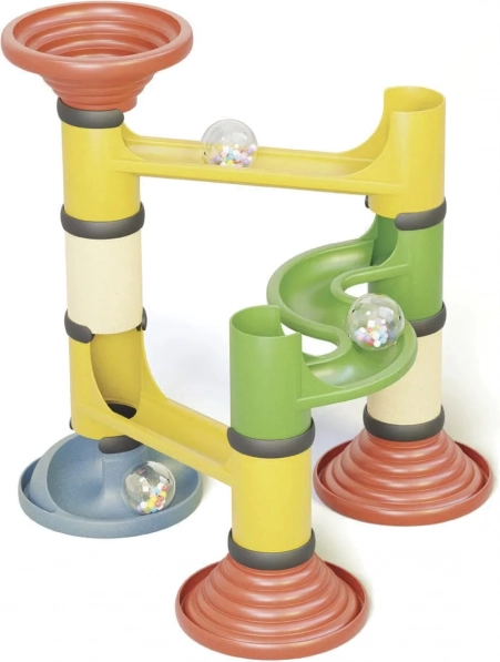 Mit diesem einzigartigen Bauset können Kinder dank einfacher Verbindungen schnell und intuitiv verschiedene Kugelbahnen bauen. Alle Teile bestehen aus innovativem Biokunststoff, der Holzfasern und Kunststoff kombiniert. Diese umweltfreundliche Wahl reduziert die CO2-Emissionen bei der Herstellung erheblich, und die Materialien sind zu 100% recycelbar. Das Spielzeug sieht nicht nur aus und riecht wie Holz, sondern ist auch strapazierfähig und angenehm zu berühren.