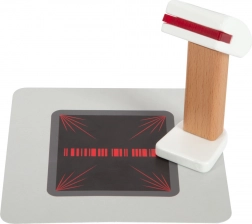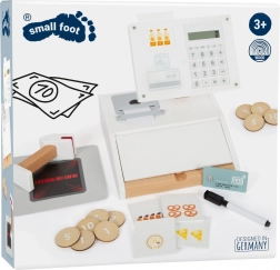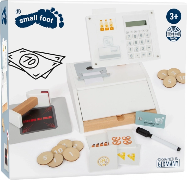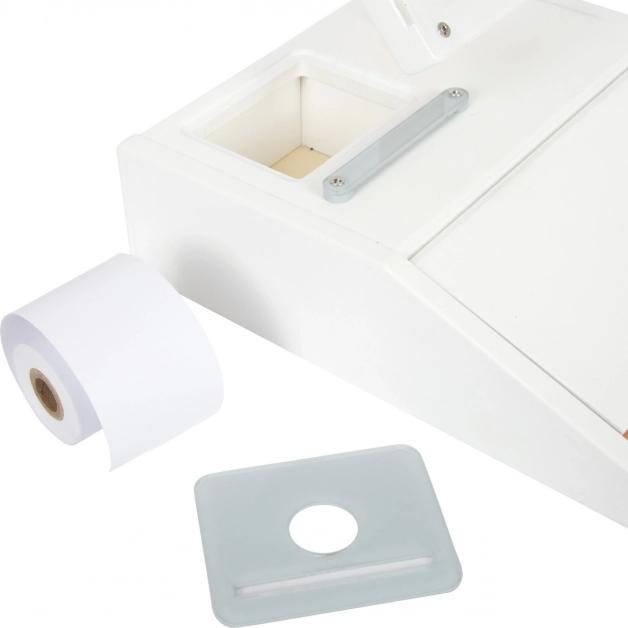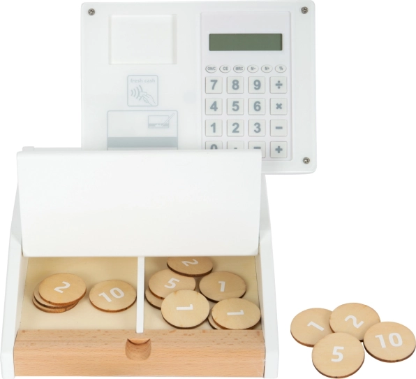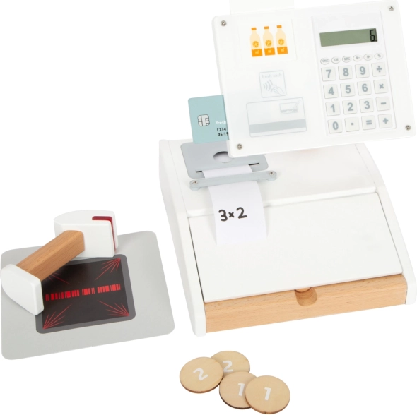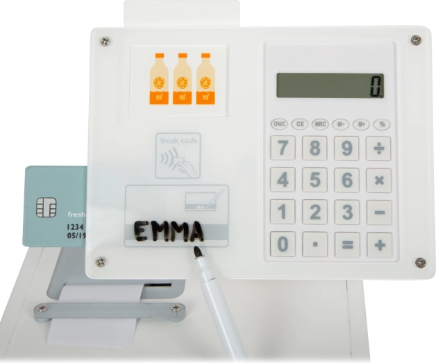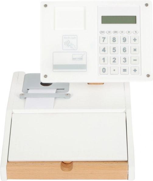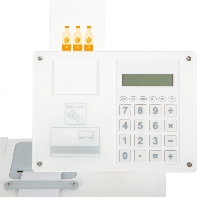 Die Holzkasse SMALL FOOT Fresh verwandelt jede Kinderecke in einen kleinen Supermarkt. Dank des integrierten Taschenrechners im drehbaren Monitor können Kinder den Einkauf leicht berechnen, die große Schublade mit Münzfächern öffnen und eine bargeldlose Zahlung mit eigener Karte und Unterschrift auf Plexiglas ausprobieren.