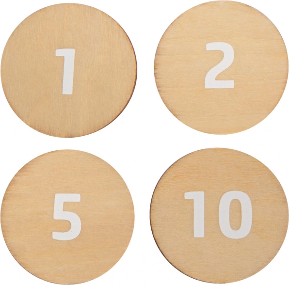 Beidseitige Holzmünzen und Produktkarten helfen Kindern spielerisch beim Üben des Rechnens, beim Erkennen von Werten und bei grundlegender finanzieller Bildung.