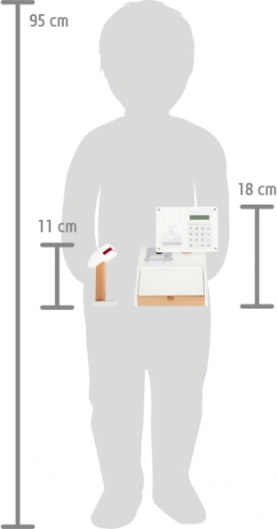 Enthalten sind Produktkärtchen, ein Barcode‑Leser, eine abreißbare Belegrolle, ein Scanner und 15 beidseitige Holzmünzen. Die Kombination aus Holz und Kunststoff garantiert Robustheit sowie ein angenehmes nordisches Design mit sichtbarer Holzmaserung. Die Kasse unterstützt das Lernen des Rechnens, fördert die Fantasie und die soziale Interaktion beim Kaufladen-Spiel.