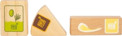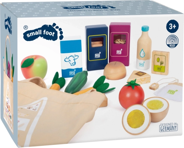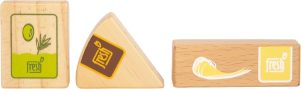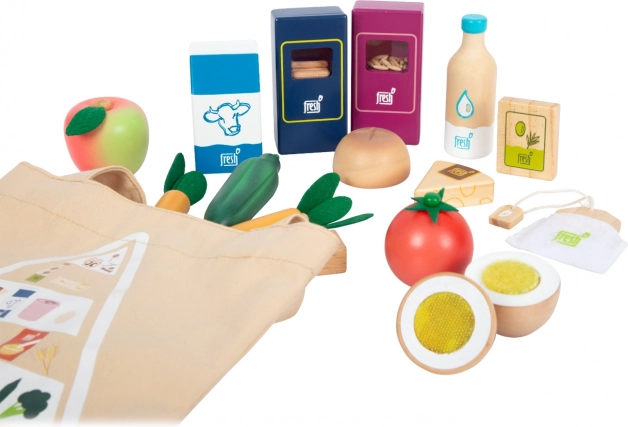 Das Vegetarische Lebensmittel-Set Fresh bietet Kindern alles, was sie für kreative Koch- und Kaufladen-Spiele brauchen. Holzteile wie Milch, Butter, Käse, Öl, Ei, Reis, Nudeln, Backwaren, Apfel, Tomate, Gurke und Karotte werden durch eine Wasserflasche und einen Teebeutel ergänzt. Realistische Details, inklusive Sichtfenster bei den Reis- und Nudelverpackungen (sie machen beim Schütteln Geräusche), erhöhen die Attraktivität und Authentizität des Spiels.