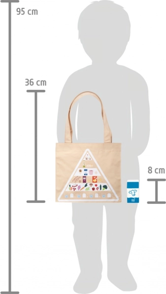 Dank der Baumwolltasche mit Aufdruck der Ernährungspyramide lernen Kinder spielerisch richtiges Essen, Ökologie und verantwortungsbewusstes Einkaufen. Die robuste Verarbeitung aus Holz und Textil liegt gut in der Hand und ist ideal für Kinderküchen und Verkaufsstände. Das Set ist mit weiteren Produkten der „Fresh“-Reihe kompatibel.