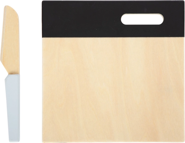 Auf eine Seite des Brettes kann mit Kreide geschrieben werden. Kinder können Einkaufszettel oder Rezepte notieren und das Brett dank der Öse leicht aufhängen.