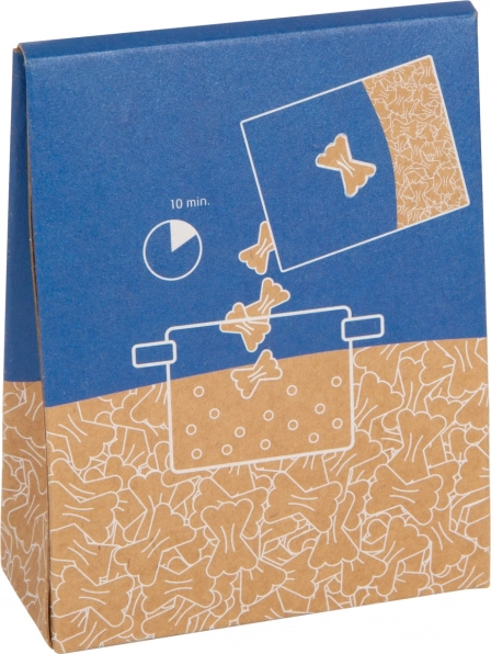 Die Kartonschachtel lässt sich leicht öffnen und schließen und bietet auf der Rückseite eine gut verständliche bebilderte „Koch“-Anleitung.