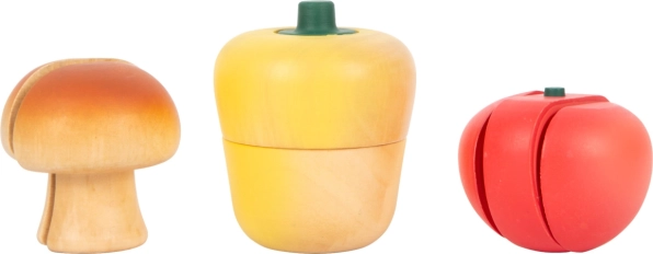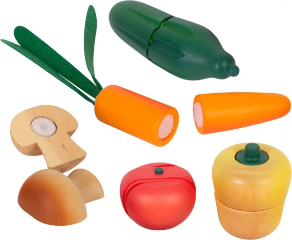 Tomate, Paprika, Gurke, Möhre und Champignon sind in Hälften geteilt und halten dank Klettverschluss zusammen – ideal, um sicheres Schneiden zu üben.